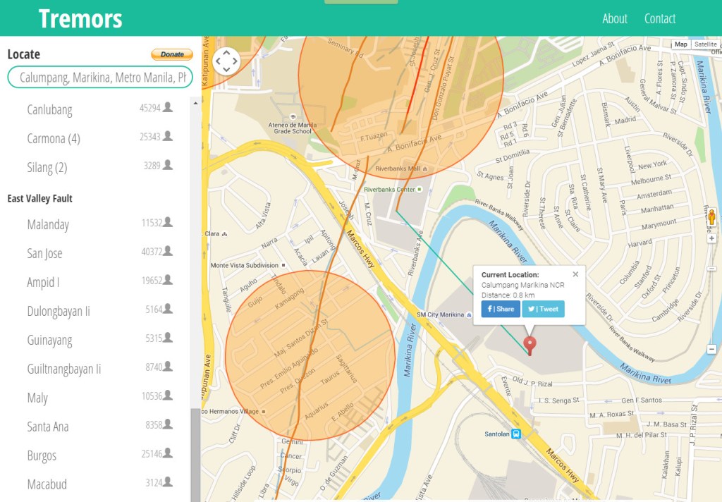 Dominic Tuazon, Louis Michael Concepcion, Mic Gutierrez, Kyle Abughanem, and Emmanuel Soriano – aka Team Instigators came up with an interactive map that tells you your distance from the fault line by just entering your location or barangay on the search box.